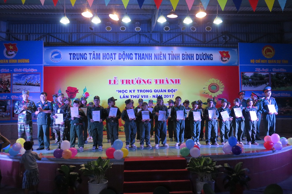 Tối ngày 10/6/2017, tại Trung tâm Hoạt động Thanh niên tỉnh, Ban Thường vụ Tỉnh Đoàn phối hợp với Thường vụ Đảng ủy Bộ Chỉ huy Quân sự tỉnh Bình Dương tổ chức Lễ Trưởng thành cho các chiến sĩ tham gia chương trình “Học kỳ trong Quân đội” năm 2017.