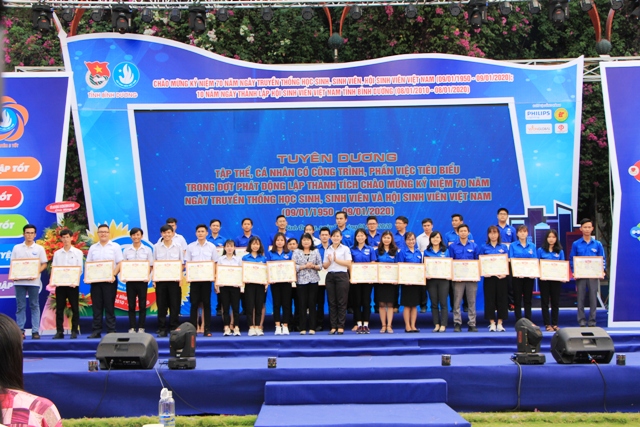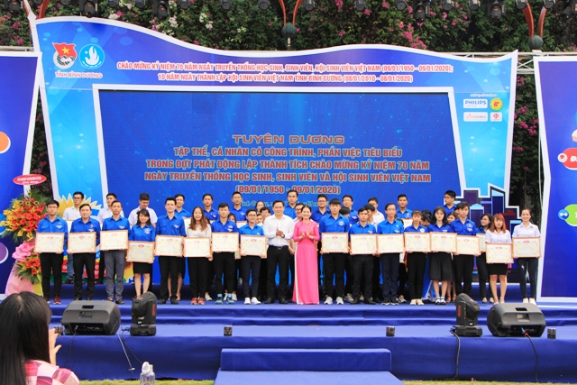 Dịp này, Ban Thường vụ Tỉnh Đoàn trao tặng Bằng khen cho 70 tập thể, cá nhân có thành tích xuất sắc trong thi đua, thực hiện các nhiệm vụ chào mừng kỷ niệm 70 năm Ngày truyền thống học sinh, sinh viên, Hội Sinh viên Việt Nam và 10 năm thành lập Hội Sinh viên Việt Nam tỉnh Bình Dương.