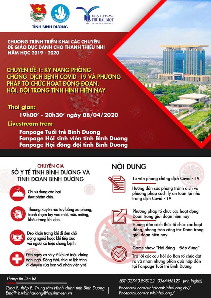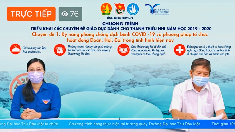 Được biết, Chương trình livestream triển khai các chuyên đề Giáo dục và Đồng hành dành cho thanh thiếu nhi năm học 2019 - 2020 với chủ đề: “Đoàn Thanh niên - Bạn đồng hành với thanh thiếu nhi” do Ban Thường vụ Tỉnh Đoàn, Hội Sinh viên Việt Nam tỉnh Bình Dương phối hợp với công ty TNHH Thanh niên Việt Nam và trường Đại học Thủ Dầu Một tổ chức. Chương trình bao gồm 10 chuyên đề chính thuộc các mảng công tác của Đoàn bao gồm: Tuyên truyền giáo dục, Nâng cao chất lượng tổ chức của Đoàn, Tuổi trẻ sáng tạo, Quốc tế thanh niên, Đồng hành cùng đoàn viên, thanh niên trong lập nghiệp, khởi nghiệp và Công tác chăm sóc giáo dục thiếu niên, nhi đồng được phát sóng định kỳ vào thứ tư hàng tuần và các chuyên đề tư vấn tuyển sinh, hướng nghiệp ngành nghể do đội ngũ giảng viên, chuyên gia đến từ trường Đại học Thủ Dầu Một thực hiện được phát sóng định kỳ vào thứ ba và thứ sáu hàng tuần từ nay cho đến hết tháng 6 năm 2020 trên các trang mạng xã hội (fanpage) của Đoàn - Hội - Đội cấp tỉnh.