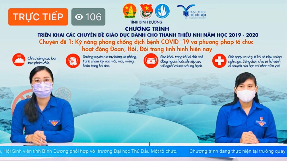 TTBD - Nằm trong chuỗi chương trình triển khai các chuyên đề giáo dục dành cho thanh thiếu nhi tỉnh Bình Dương năm học 2019 - 2020 với chủ đề “Đoàn Thanh niên - Bạn đồng hành với thanh thiếu nhi” với chuyên đề 1: Kỹ năng phòng, chống dịch bệnh, vào tối ngày 8/4/2020 tại trường quay Đại học Thủ Dầu Một, Ban Thường vụ Tỉnh Đoàn, Hội Liên hiệp Thanh niên, Hội Sinh viên, Hội đồng Đội tỉnh Bình Dương đã phối hợp cùng trường Đại học Thủ Dầu Một tổ chức Chương trình livestream trực tuyến triển khai chuyên đề “Kỹ năng phòng, chống dịch bệnh và phương pháp tổ chức hoạt động Đoàn, Hội, Đội trong tình hình hiện nay”.