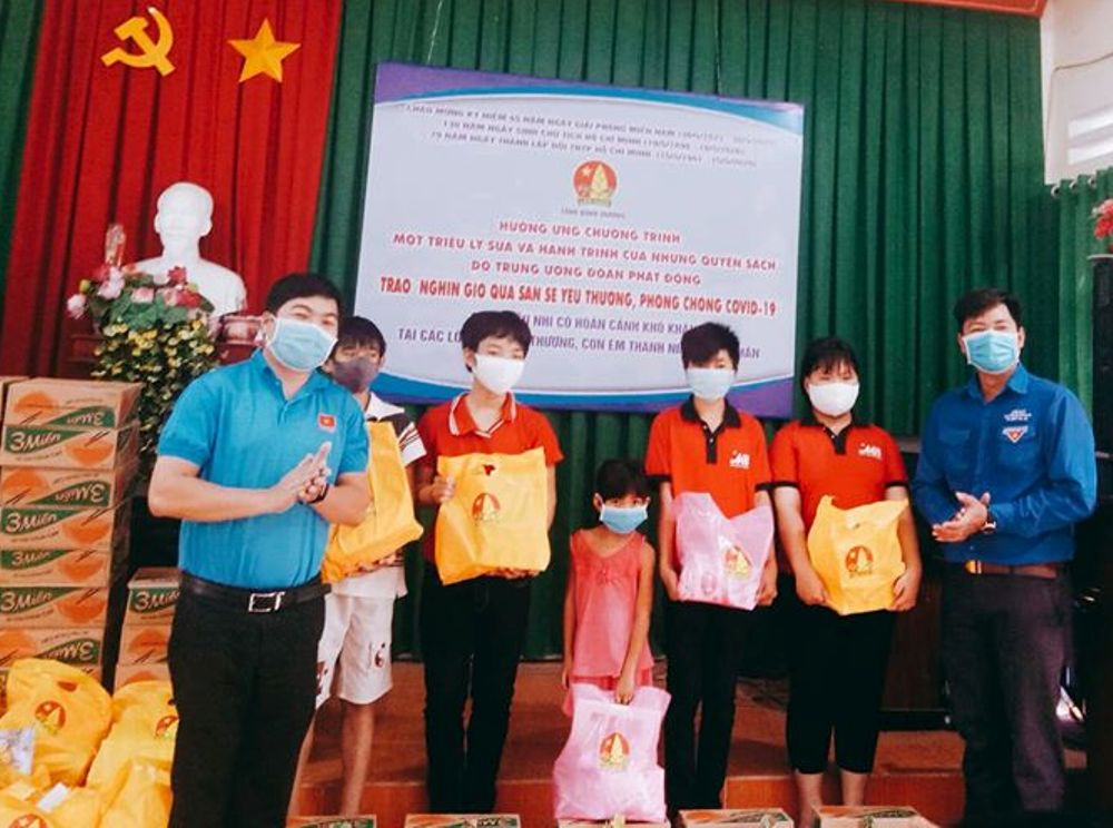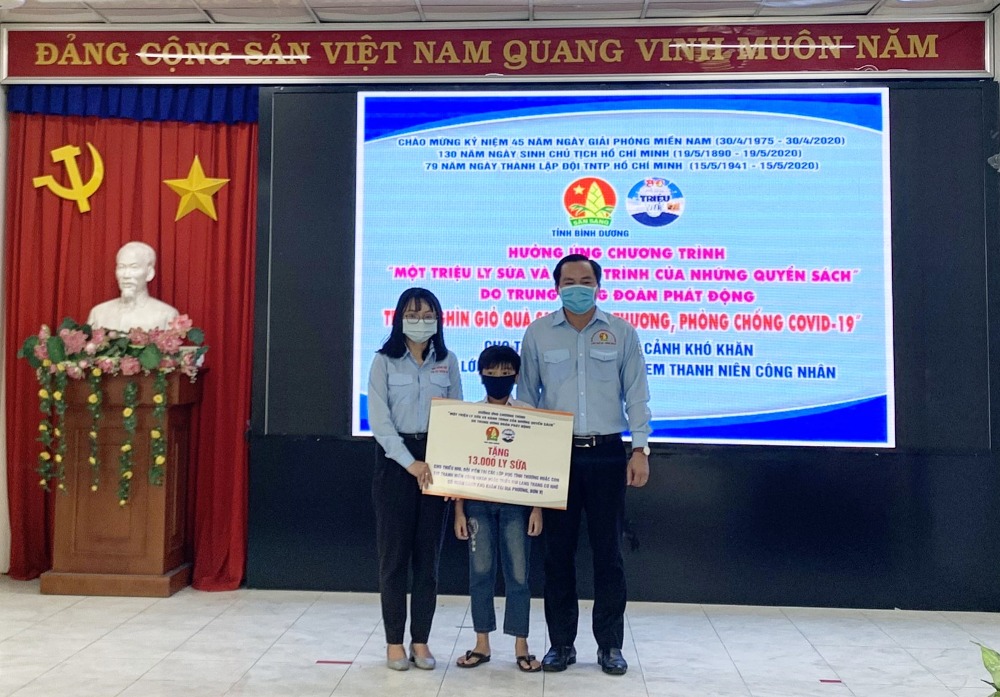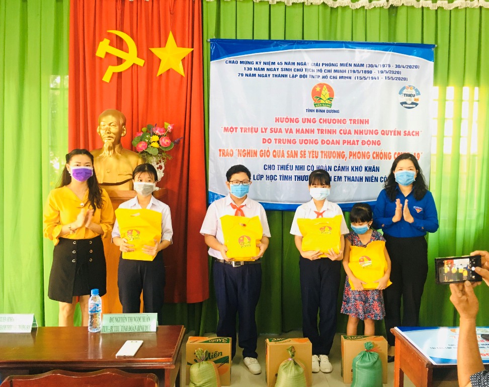 TTBD - Hưởng ứng Chương trình “Triệu ly sữa” và “ Hành trình những quyển sách” do Trung ương Đoàn, Hội đồng Đội Trung ương phát động, sáng ngày 22/4/2020, Ban Thường vụ Tỉnh đoàn, Hội đồng đội tỉnh Bình Dương đã trao tặng 1 tấn gạo, 200 phần quà, 2.000 ly sữa và 2.000 quyển sách với tổng giá trị 70.000.000 đồng cho thiếu nhi có hoàn cảnh khó khăn tại các lớp học tình thương, con em thanh niên công nhân và phát động chương trình “Triệu ly sữa và “Hành trình những quyển sách” tại thành phố Thủ Dầu Một, Thành phố Thuận An, Thành phố Dĩ An, Thị xã Tân Uyên nhân dịp kỷ niệm 45 năm ngày Giải phóng miền Nam thống nhất đất nước (30/4/1975 - 30/4/2020); 130 năm ngày sinh Chủ tịch Hồ Chí Minh (19/5/1890 - 19/5/2020); 79 năm ngày thành lập Đội TNTP Hồ Chí Minh (15/5/1941 - 15/5/2020).