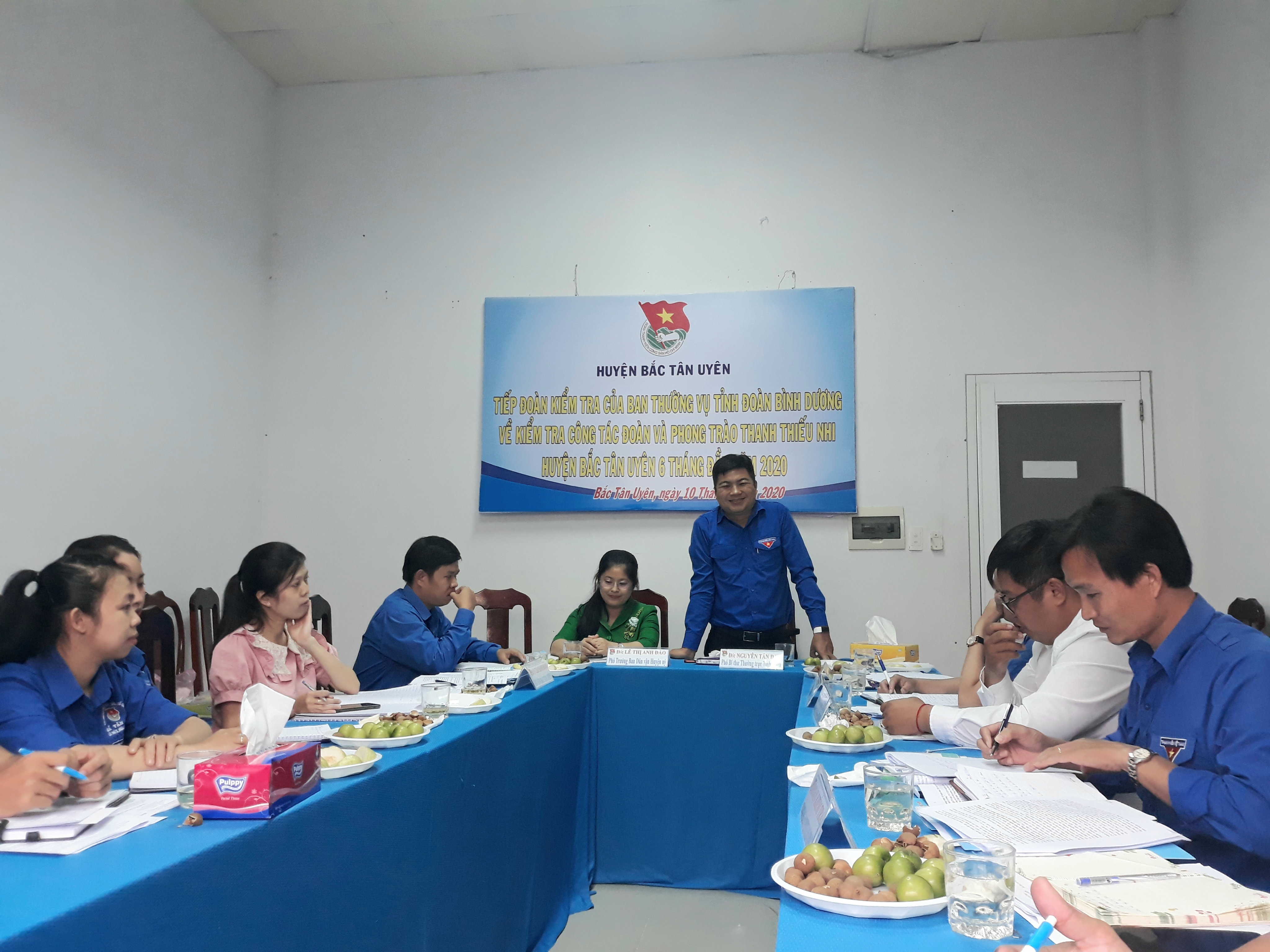 TTBD - Thực hiện Thông báo số 547-TB/TĐTN-TCKT, ngày 14/5/2020 của Ban Thường vụ (BTV) Tỉnh đoàn Bình Dương về kiểm tra chuyên đề 1; trong các ngày 07, 10/7/2020, BTV Tỉnh đoàn đã tổ chức các Đoàn kiểm tra đối với các đơn vị Huyện đoàn Bàu Bàng và Huyện đoàn Bắc Tân Uyên.
