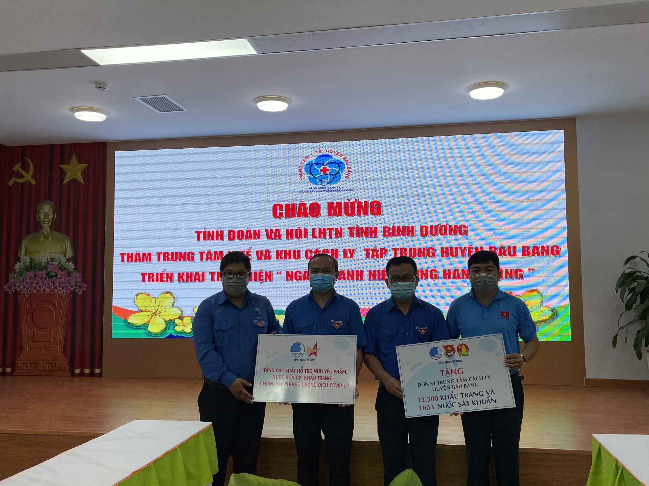 Trong khuôn khổ chương trình công tác, Đoàn đã đến thăm hỏi, động viên đơn vị Thành đoàn Thành phố Thủ Dầu Một và tặng 15.000 khẩu trang y tế, 100 lít nước rửa tay để đảm bảo cung cấp cho khu vực đang có dịch tại phường Phú Hòa, thành phố Thủ Dầu Một. Tiếp đến, Đoàn công tác đến thăm và làm việc với đội ngũ y bác sĩ, tình nguyện viên khu cách ly tại trung tâm cách ly huyện Bàu Bàng, tại đây Đoàn công tác đã được lắng nghe các hoạt động trong thời gian vừa qua mà toàn thể các Y Bác sĩ, nhân viên, tình nguyện viên, người bệnh đã làm được trong suốt khoản thời gian cách ly cộng đồng, kết thúc buổi làm việc Đoàn công tác đã trao tặng cho đơn vị huyện Bàu Bàng 12.500 khẩu trang y tế, 100 lít nước rửa tay sát khuẩn. Đối với các đơn vị Trung tâm cách ly Phú Giáo, Đại học Thủ Dầu Một, Trung tâm cách ly Bến Cát do tình hình dịch bệnh căng thẳng tại khu vực nên các phần quà sẽ được chuyển đến cho đơn vị, cụ thể tặng đơn vị huyện Phú Giáo 12.500 khẩu trang, 100 lít nước rửa tay, đơn vị Đại học Thủ Dầu Một 7.500 khẩu trang, 50 lít nước rửa tay sát khuẩn và đơn vị Bến Cát 12.500 khẩu trang, 100 lít nước rửa tay.