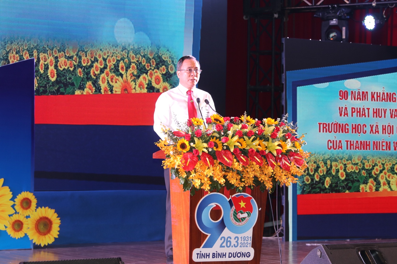 Thay mặt BTV Tỉnh ủy, đồng chí đề nghị Đoàn TNCS Hồ Chí Minh Tỉnh nhà cần tập trung thực hiện các nhiệm vụ trọng tâm sau để phát huy truyền thống  vẻ vang  của Đoàn  trong 90 năm qua, với vai trò đội dự bị tin cậy của Đảng, là lực lượng xung kích, hùng hậu trên mọi lĩnh vực, trong bối cảnh kinh tế - xã hội của Tỉnh phát triển năng động và nhu cầu  đa dạng của Thanh thiếu nhi: Trước hết phải tiếp tục kế thừa, giữ gìn và phát huy truyền thống tốt đẹp của tổ chức Đoàn 90 năm qua, các cấp bộ Đoàn và Tuổi trẻ Bình Dương phải luôn nêu cao lòng tự hào dân tộc, tự hào với truyền thống quê hương, giữ vững niềm tin sắt son với Đảng, Nhà nước, với Nhân dân; biến những khó khăn, thách thức thành động lực; kiên trì, kiên định thực hiện vị trí, chức năng, vai trò của mình trong hệ thống chính trị; phát huy tinh thần đoàn kết dân tộc; khơi dậy mạnh mẽ trong đoàn viên, thanh niên tinh thần nhiệt huyết, ý chí tự lực, tự cường, khát vọng vươn lên và khát khao cống hiến cho quê hương, đất nước, luôn tiên phong đi đầu, xung kích, sáng tạo trong sự nghiệp xây dựng và bảo vệ Tổ quốc. Phải đặc biệt coi trọng và làm tốt hơn nữa công tác giáo dục chính trị, tư tưởng, văn hóa cho thanh niên, góp phần tích cực đào tạo, bồi dưỡng thế hệ trẻ có đủ phẩm chất, năng lực để kế thừa sự nghiệp vẻ vang của Đảng, thực hiện công nghiệp hóa, hiện hóa đất nước và tỉnh nhà. Tổ chức học tập, quán triệt sâu sắc trong đoàn viên thanh niên tỉnh nhà tinh thần Nghị quyết Đại hội đại biểu lần thứ XIII của Đảng và Nghị quyết của Đảng bộ tỉnh lần thứ XI, nhất là các chủ trương, định hướng, nhiệm vụ đối với tổ chức Đoàn và đoàn viên, thanh niên. Tiếp tục đẩy mạnh việc học tập và làm theo tư tưởng, đạo đức, phong cách chủ tịch Hồ Chí Minh. Tiếp tục đổi mới mạnh mẽ nội dung và phương thức hoạt động của tổ chức Đoàn, không ngừng mở rộng mặt trận đoàn kết, tập hợp thanh niên, nhất là thanh niên công nhân, tri thức, doanh nhân trẻ; các phong trào, mô hình hoạt động của Đoàn của tỉnh phải có những nét đặc trưng riêng, phải thiết thực, hiệu quả và mang tính bền vững. Mạnh dạn tham mưu đề xuất với cấp ủy, chính quyền những cách làm hay và mô hình sáng tạo. Trước mắt, tổ chức đoàn cần chủ động tham gia tích cực, hiệu quả để góp phần thực hiện thành công cuộc bầu cử Đại biểu Quốc hội và Đại biểu Hội đồng Nhân dân các cấp nhiệm kỳ 2021 - 2026 trên địa bàn tỉnh. Cần coi trọng nhiệm vụ xây dựng tổ chức Đoàn thực sự vững mạnh cả về chính trị, tư tưởng và tổ chức, để luôn xứng đáng là đội dự bị tin cậy của Đảng. Bên cạnh đó, tổ chức Đoàn cần quan tâm và chủ động hơn nữa trong công tác quy hoạch, đào tạo, bồi dưỡng, chuẩn bị nguồn cán bộ kề cận; rèn luyện và lựa chọn những cán bộ ưu tú, trưởng thành, có đủ phẩm chất và năng lực để giới thiệu, bổ sung nguồn cán bộ trẻ cho Đảng và cả hệ thống chính trị.