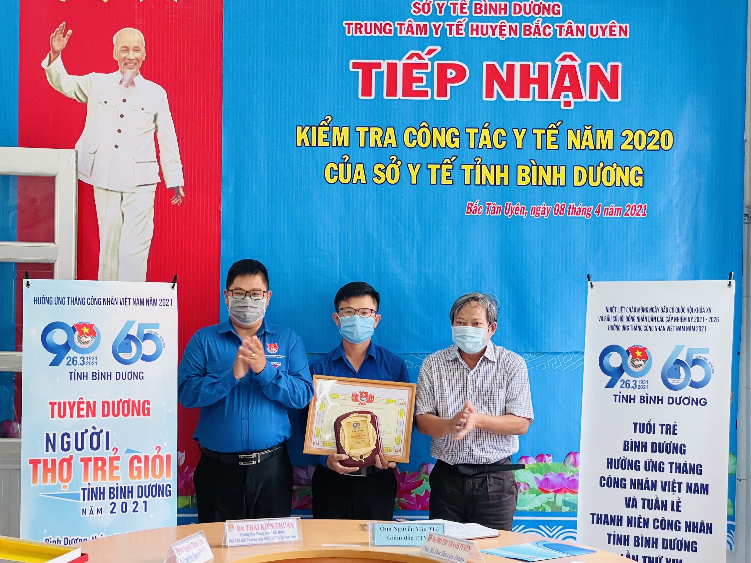 Đồng chí Thái Kiến Thuận - Ủy viên Ban Thường vụ, Trưởng ban Phong trào Tỉnh đoàn, Phó Chủ tịch Thường trực Hội LHTN Việt Nam tỉnh trao gương Người thợ trẻ giỏi cho đồng chí Trương Văn Thái - Đoàn viên Chi đoàn Trung tâm Y tế huyện Bắc Tân Uyên.