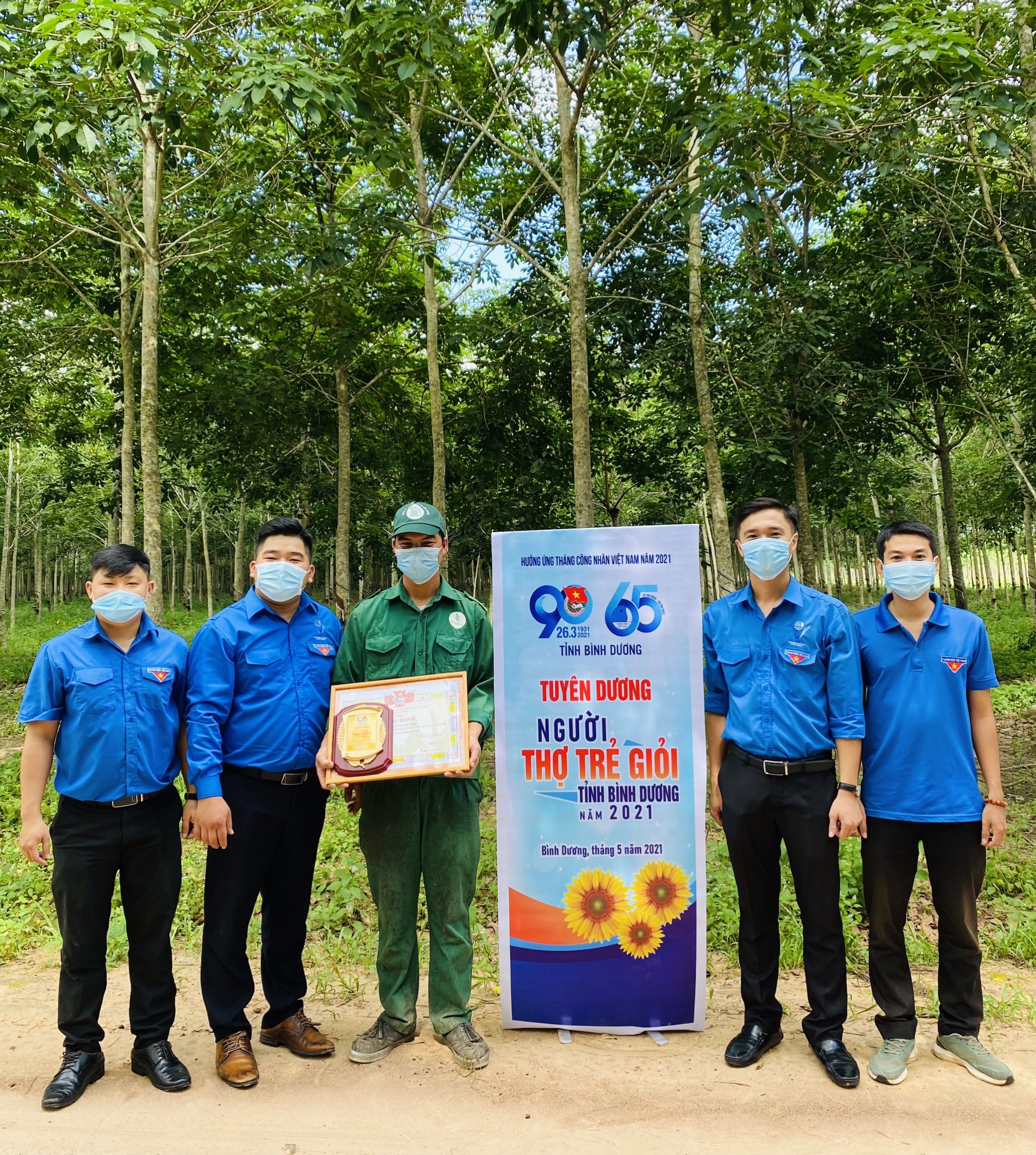 Đồng chí Nguyễn Thành Lâm - Ủy viên Ban Chấp hành, Phó Trưởng ban Phong trào Tỉnh đoàn, Phó Chủ tịch Hội LHTN Việt Nam tỉnh trao gương Người thợ trẻ giỏi cho đồng chí Nguyễn Thanh Phong - Uỷ viên Ban Chấp hành Chi đoàn 2, Nông trường cao su Long Tân, Công ty TNHH MTV CS Dầu Tiếng.
