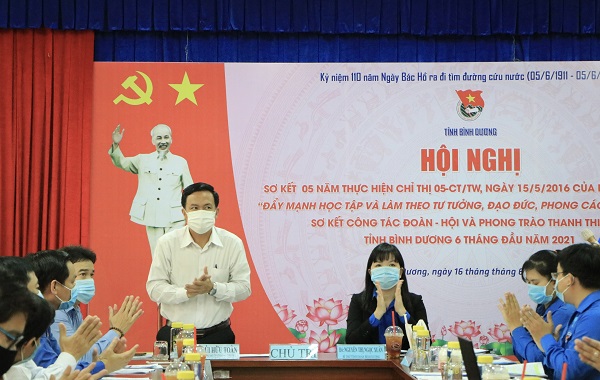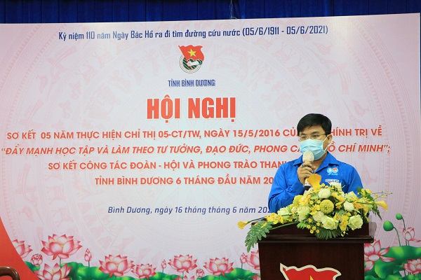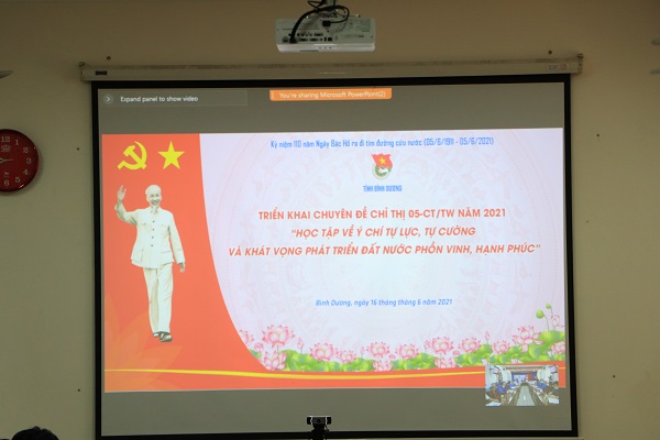 Tại Hội nghị, Ban Thường vụ Tỉnh Đoàn Bình Dương tổ chức Sơ kết 05 năm thực hiện Chỉ thị 05-CT/TW ngày 15/5/2016 của Bộ Chính trị về “Đẩy mạnh làm theo tư tưởng, đạo đức, phong cách Hồ Chí Minh” và 03 năm thực hiện Cuộc vận động “Mỗi ngày một tin tốt, mỗi tuần một câu chuyện đẹp” trên mạng xã hội. Các đại biểu được xem Phóng sự kết quả 05 năm thực hiện Chỉ thị 05-CT/TW của Bộ Chính trị về “Đẩy mạnh làm theo tư tưởng, đạo đức, phong cách Hồ Chí Minh” giai đoạn 2016 – 2021 và 03 năm thực hiện Cuộc vận động “Mỗi ngày một tin tốt, mỗi tuần một câu chuyện đẹp” trên mạng xã hội, nghe triển khai Kết luận số 01-KL/TW ngày 18/5/2021 của Bộ Chính trị về tiếp tục thực hiện Chỉ thị số 05-CT/TW ngày 15/5/2016 của Bộ Chính trị khóa XII “Về đẩy mạnh học tập và làm theo tư tưởng, đạo đức, phong cách Hồ Chí Minh” và triển khai chuyên đề Chỉ thị 05-CT/TW năm 2021: “Học tập về ý chí tự lực, tự cường và khát vọng phát triển đất nước phồn vinh, hạnh phúc”.