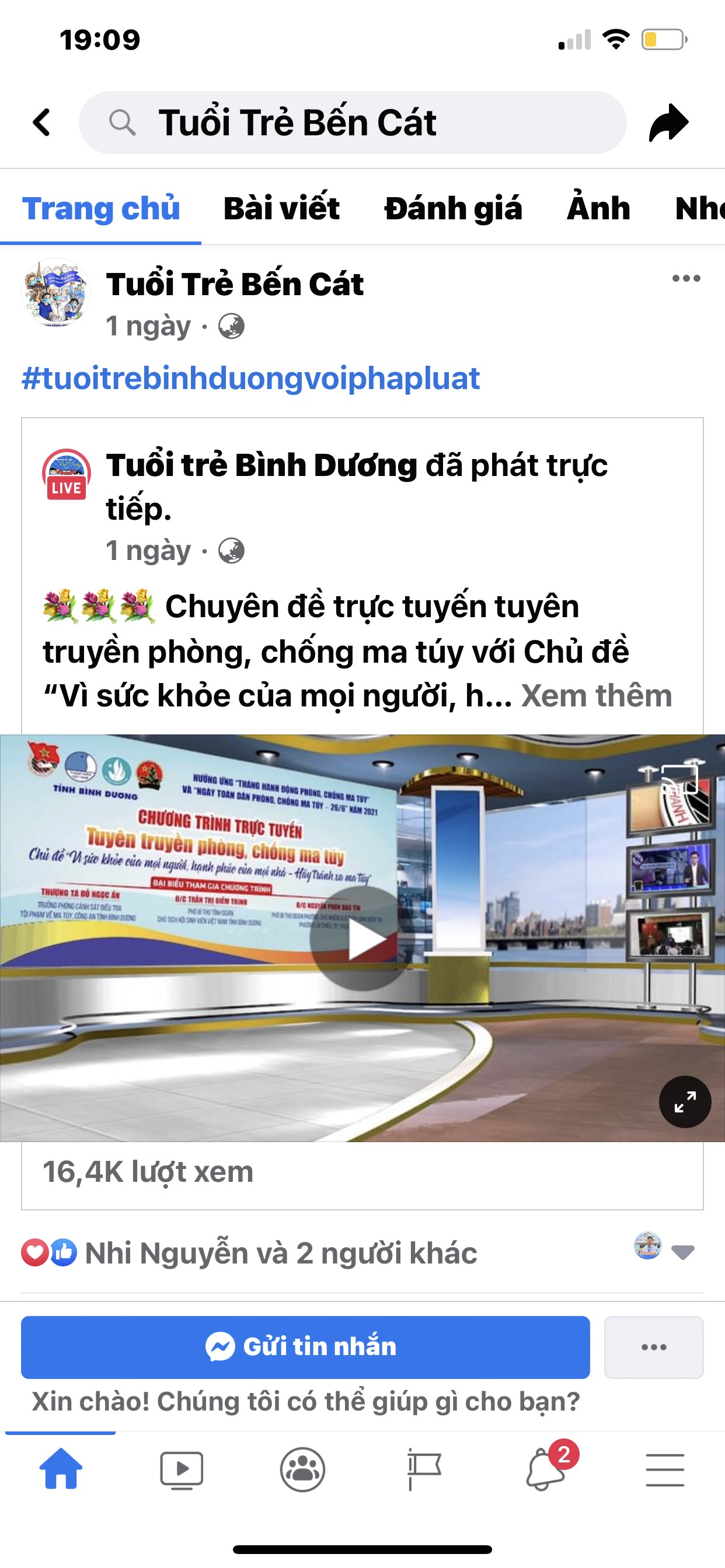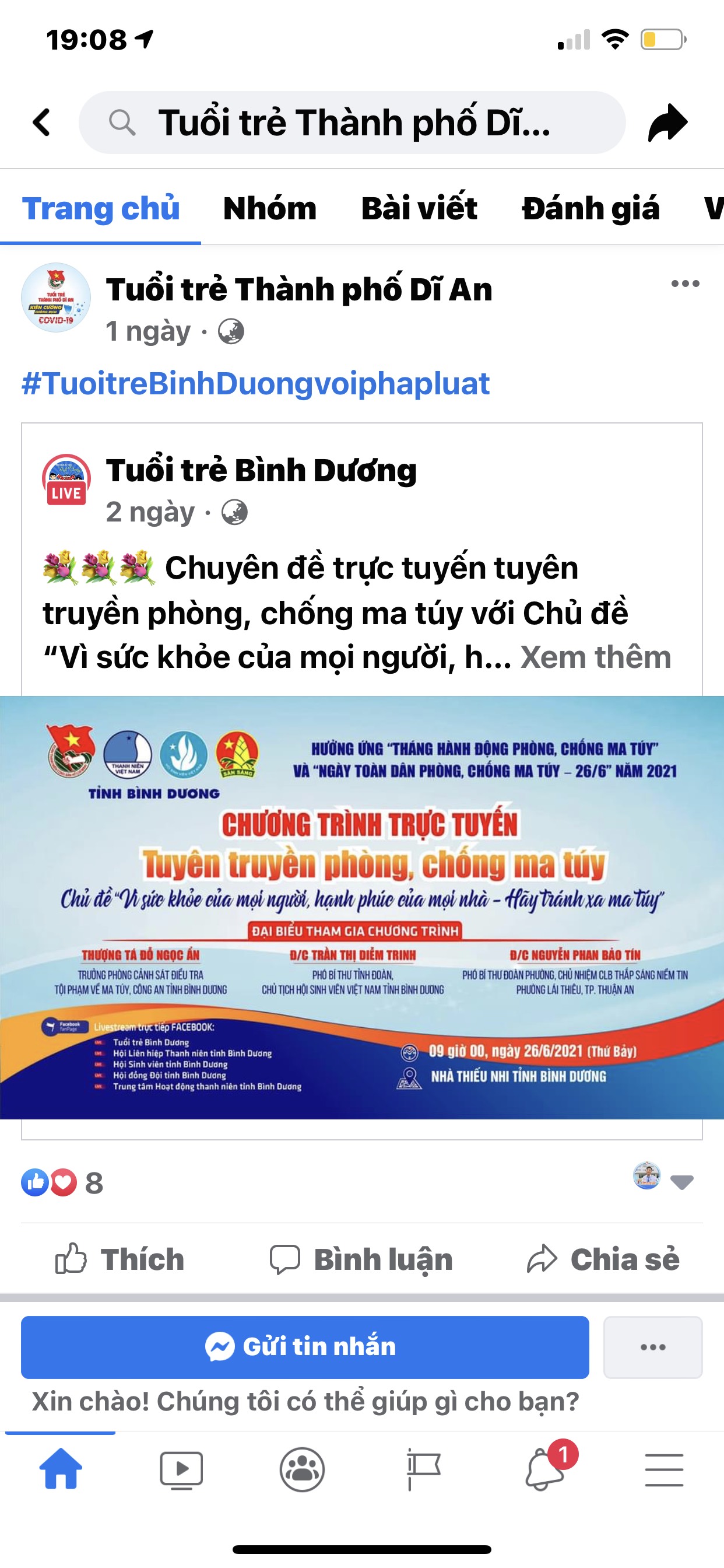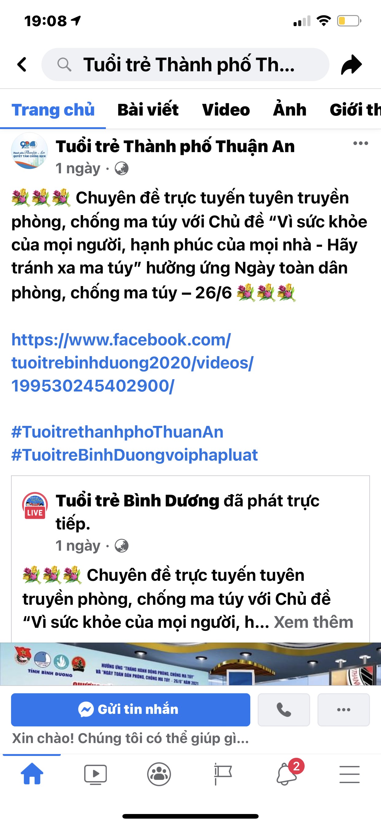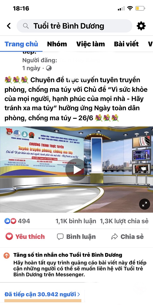 TTBD-Sáng ngày 26/6, Ban Thường vụ Tỉnh Đoàn tổ chức Chuyên đề trực tuyến tuyên truyền phòng, chống ma túy, Chủ đề: “Vì sức khỏe của mọi người, hạnh phúc của mọi nhà – hãy tránh xa ma túy” hưởng ứng Ngày toàn dân phòng, chống ma túy - 26/6. Chuyên đề trực tuyến đã nhận được sự quan tâm, theo dõi của nhiều bạn đoàn viên, thanh niên toàn tỉnh với hơn 31.000 người tiếp cận, 500 lượt yêu thích, 1.100 bình luận và hơn 1.300 lượt chia sẻ.