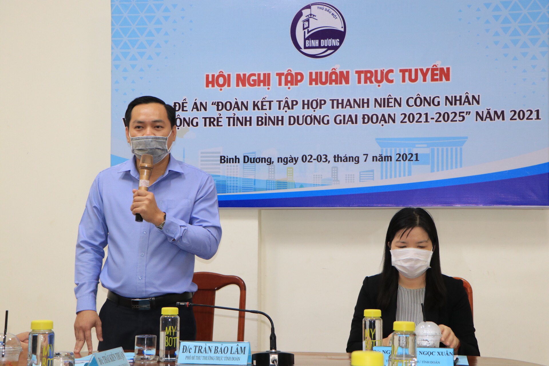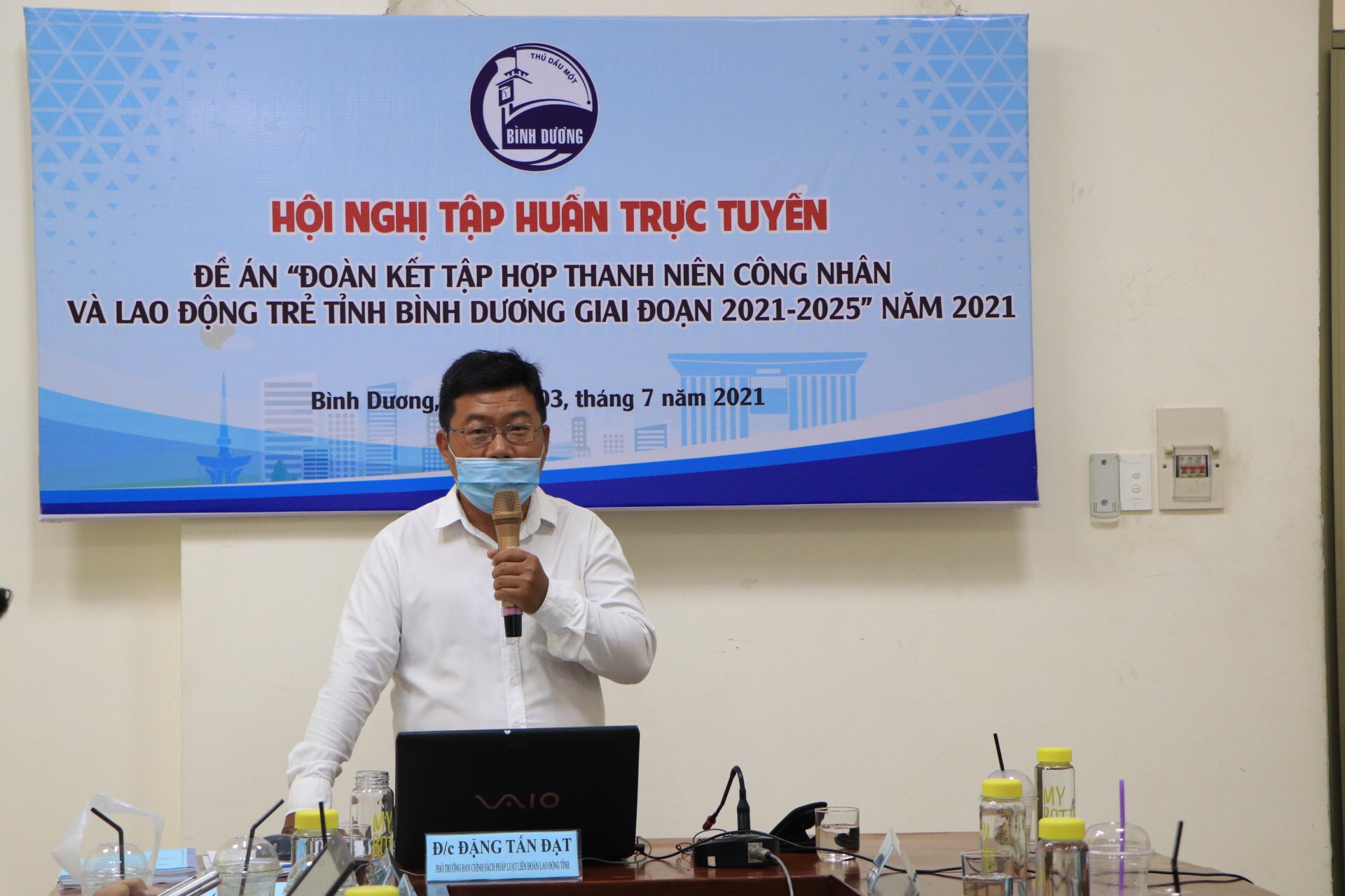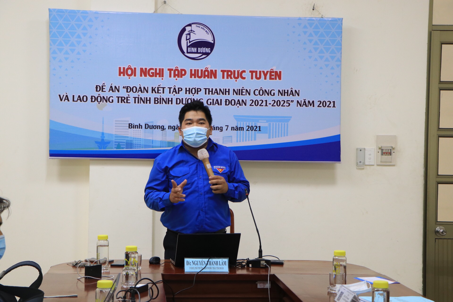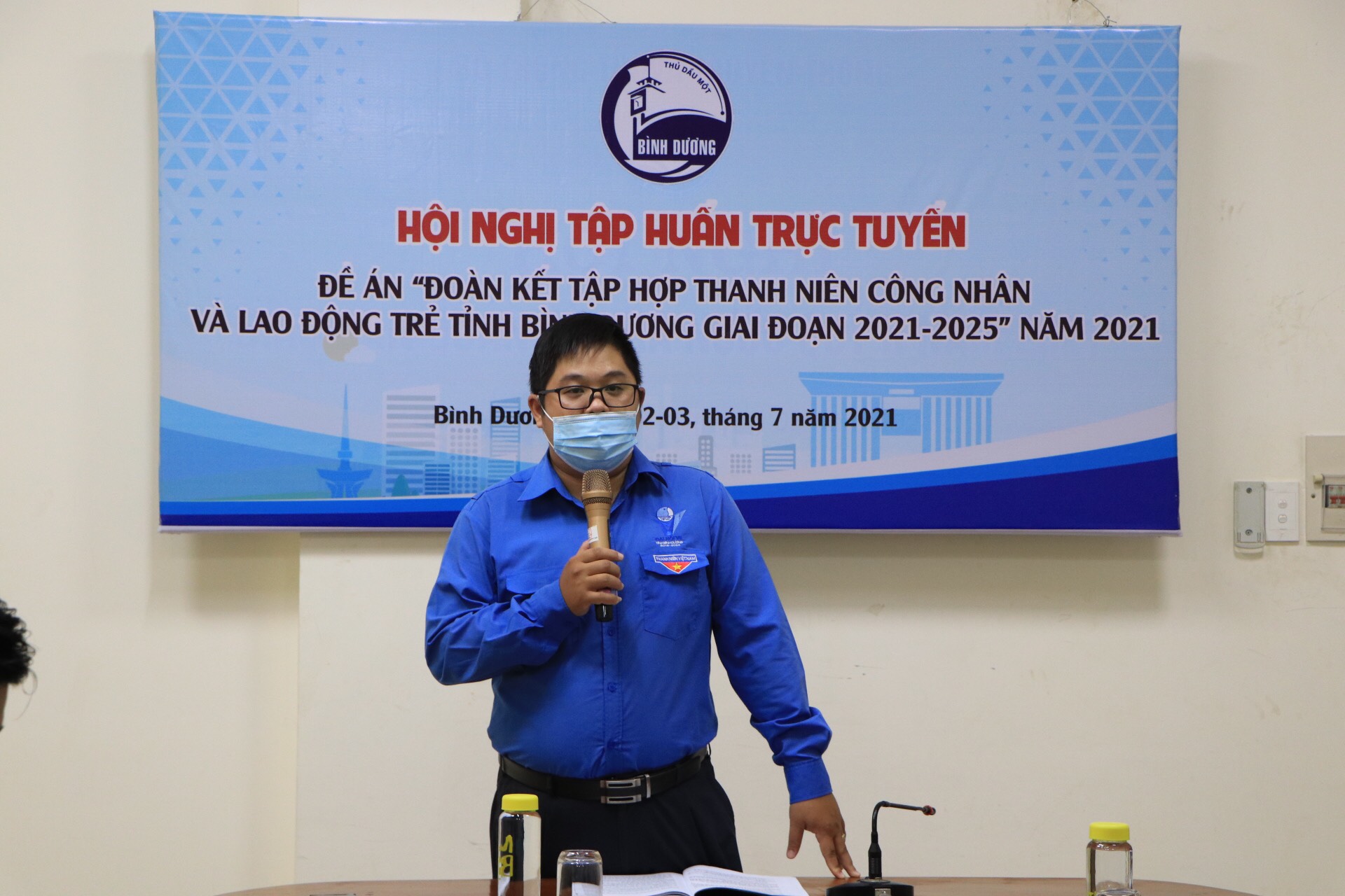 Hội nghị tập huấn trực tuyến được chia làm 02 bao gồm lớp dành cho các đồng chí cán bộ Đề án chuyên trách do Đoàn Thanh niên các cấp quản lý và lớp tập huấn dành cho các anh chị là Chi hội trưởng, Bí thư Chi đoàn thanh niên xa quê, lực lượng nòng cốt của Đề án. Tại lớp tập huấn thứ nhất vào ngày 02/7/2021 đã có sự tham gia của hơn 100 đồng chí là cán bộ Đề án do Đoàn Thanh niên các cấp quản lý. Các đồng chí đã được lắng nghe các chuyên đề thiết thực cho công tác đoàn kết, tập hợp thanh niên công nhân và lao động trẻ như: Bác sĩ Huỳnh Minh Chính – Phó Chủ tịch Thường trực Hội Thầy thuốc trẻ Tỉnh, Giám đốc Trung tâm Y tế huyện Bàu Bàng thông tin về tình hình dịch bệnh Covid-19 và các phương pháp phòng, chống dịch bệnh. Đồng chí Đặng Tấn Đạt – Phó trưởng Ban Chính sách Pháp luật Liên đoàn Lao động Tỉnh triển khai Bộ luật Lao động năm 2019. Bên Cạnh các đồng chí cũng được lắng nghe chuyên đề về các phương pháp thành lập Chi đoàn, Chi hội và kỹ năng nắm bắt thông tin, dư luận xã hội trong thanh niên công nhân do đồng chí Thái Kiến Thuận - Ủy viên Ban Thường vụ, Trưởng Ban Phong trào Tỉnh đoàn, Phó Chủ tịch Thường trực Ủy ban Hội Liên hiệp Thanh niên Việt Nam Tỉnh trình bày. Đồng thời đồng chí Nguyễn Thành Lâm - Ủy viên Ban Chấp hành, Phó Ban Phong trào Tỉnh đoàn, Phó Chủ tịch Ủy ban Hội Liên hiệp Thanh niên Việt Nam Tỉnh cũng đã triển khai các nội dung trọng tâm của Đề án “Đoàn kết, tập hợp Thanh niên công nhân và Lao động trẻ tỉnh Bình Dương giai đoạn 2021 – 2025”.