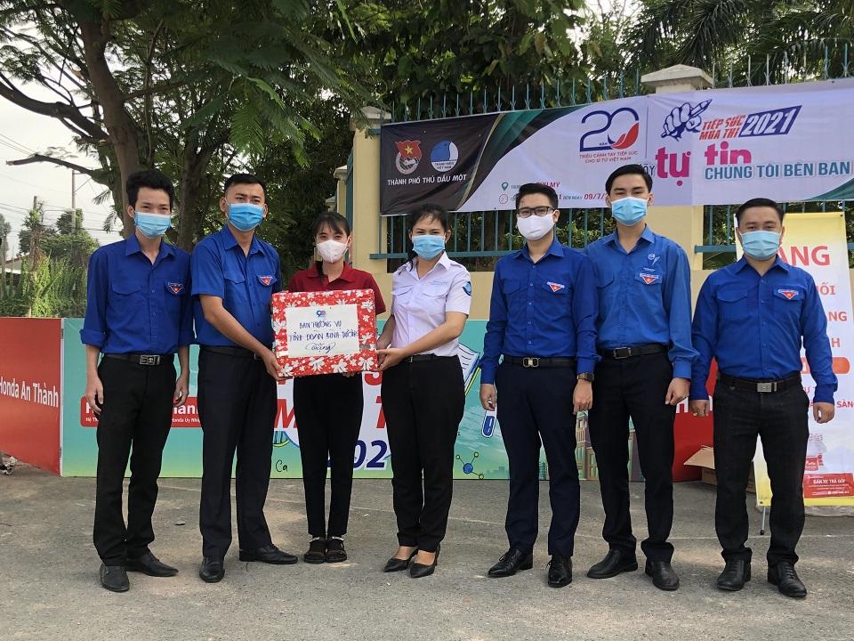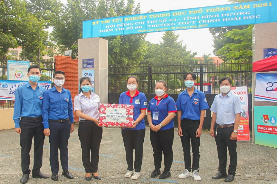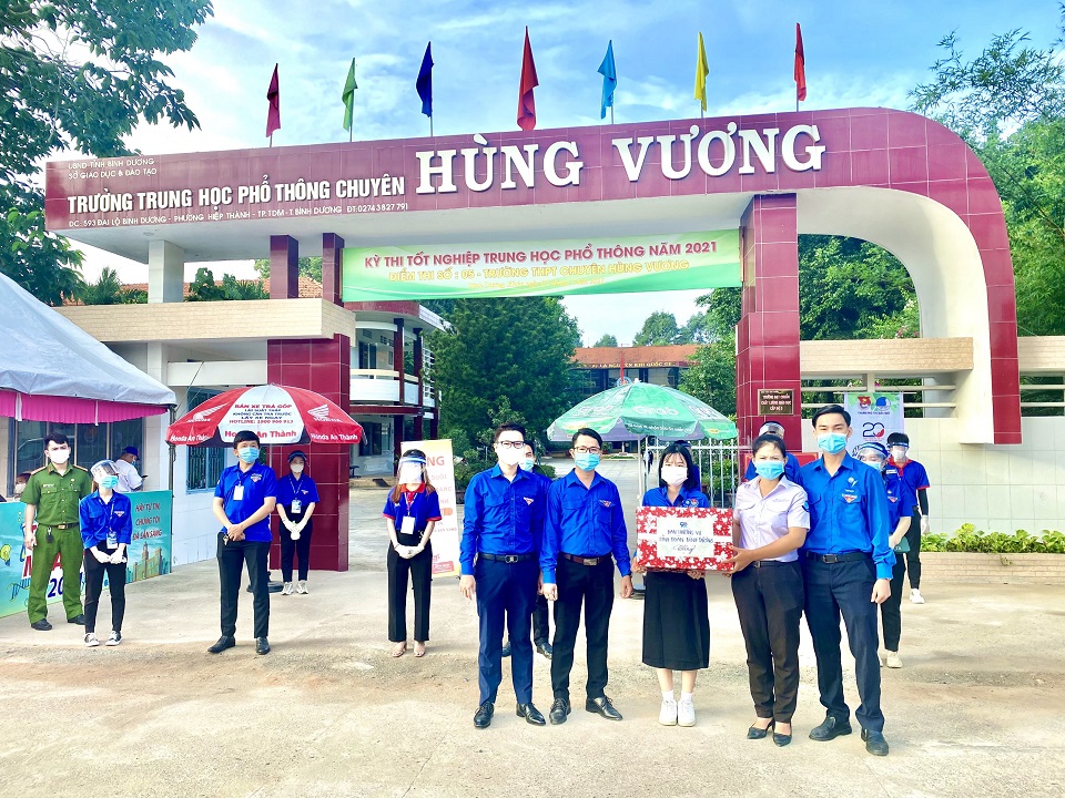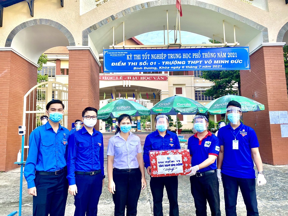 Được biết, trong kỳ thi tốt nghiệp THPT năm nay, tỉnh Bình Dương có 13.611 thí sinh dự thi tại 25 điểm thi trên địa bàn các huyện, thị xã, thành phố diễn ra từ ngày 06/7 đến ngày 09/7/2021. Với khẩu hiệu “Hãy tự tin, chúng tôi đi cùng bạn”, Ban Thường vụ Tỉnh Đoàn, Ban Thư ký Hội Sinh viên Việt Nam tỉnh Bình Dương đã chỉ đạo Ban Thường vụ các Huyện, Thị, Thành Đoàn và Ban Thư ký Hội Sinh viên các trường Đại học, Cao đẳng tổ chức thành lập 25 đội hình tại 25 điểm thi với sự tham gia của gần 500 bạn đoàn viên, thanh niên, học sinh, sinh viên tại các trường và các địa phương trong tỉnh và vận động được các nguồn lực hỗ trợ từ các mạnh thường quân để đảm bảo tốt cho các đội hình tình nguyện và các thí sinh về tham dự kỳ thi gồm 2.000 phần quà, 12.000 chai nước, 72 dù che, 3.000 cẩm nang, 1.000 suất cơm, 13.611 khẩu trang y tế và nước rửa tay và hơn 5.000 suất ăn miễn phí với sự đồng hành hỗ trợ của Công ty TNHH Bao bì Vĩnh Thành, Công ty TNHH Giấy KRAFT VINA,Công ty cổ phần Khoáng sản và Xây dựng Bình Dương, Cửa hàng Honda An Thành và Công ty TNHH Grab Việt Nam.