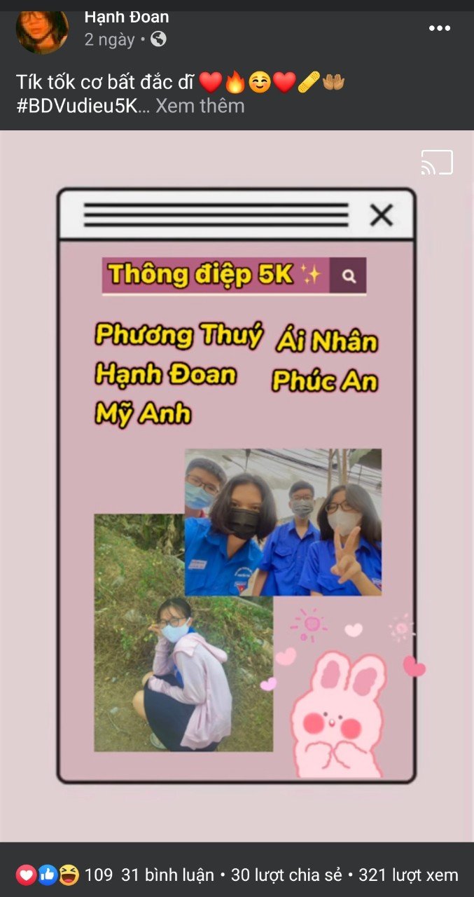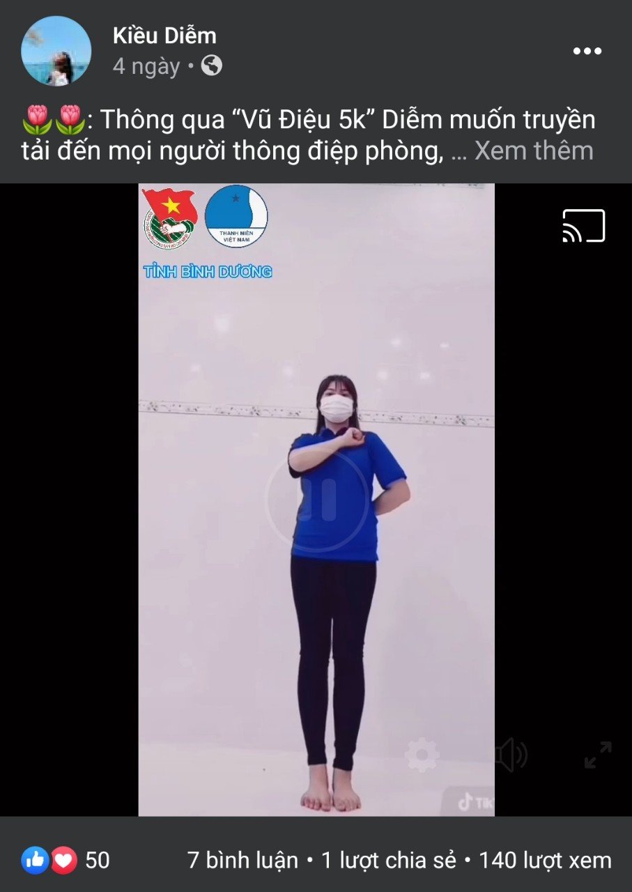 Cuộc thi nhảy “Vũ điệu 5K” của Bộ Y tế trên nền tảng ứng dụng Tiktok với chủ đề "Thanh niên Bình Dương, kiên cường chống dịch Covid-19" tiếp tục vẫn còn tiếp diễn ở các tuần tiếp theo. Tin chắc rằng Cuộc thi nhảy “Vũ điệu 5K” của Bộ Y tế trên nền tảng ứng dụng Tiktok nhận được sự quan tâm, tham gia hưởng ứng tích cực từ phía các bạn Đoàn viên, Hội viên, thanh niên trên địa bàn tỉnh để thể hiện quyết tâm đẩy lùi dịch bệnh Covid – 19 của tuổi trẻ tỉnh Bình Dương.