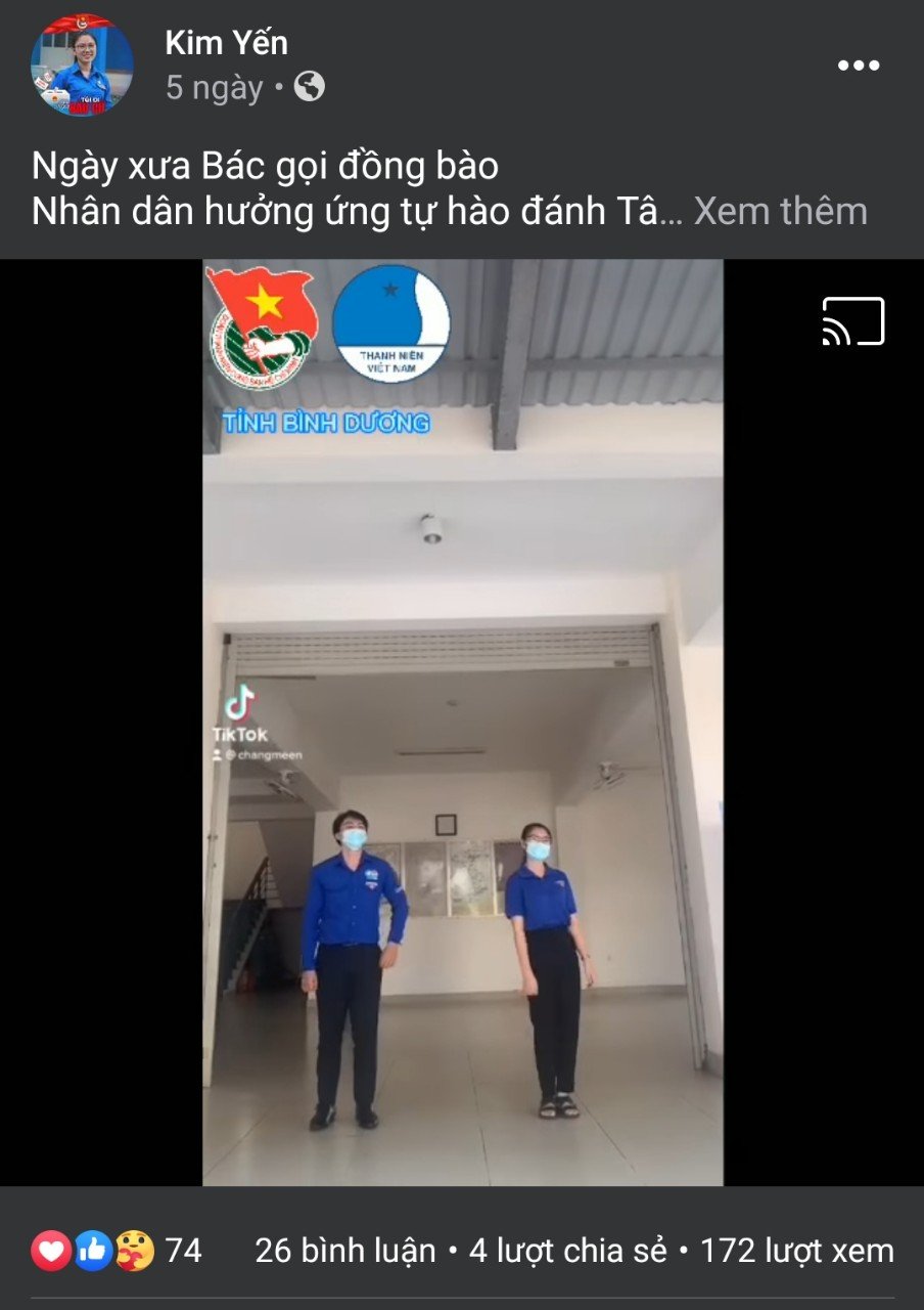TTBD - Thực hiện Kế hoạch Chiến dịch Thanh niên Tình nguyện hè tỉnh Bình Dương năm 2021 Nhằm phát huy tinh thần xung kích của Hội viên, thanh niên ; tạo sân chơi lành mạnh và thông qua đó góp phần pháp huy vai trò, tinh thần năng động, sáng tạo của tuổi trẻ tỉnh Bình Dương trong công cuộc tham gia xây dựng, phát triển kinh tế, văn hóa, xã hội của tỉnh, đặc biệt trong việc tuyên truyền phòng, chống dịch bệnh Covid - 19. Ban Thư ký Hội LHTN Việt Nam tỉnh Bình Dương đã triển khai nhảy “Vũ điệu 5K” của Bộ Y tế trên nền tảng ứng dụng Tiktok với chủ đề "Thanh niên Bình Dương, kiên cường chống dịch Covid-19".