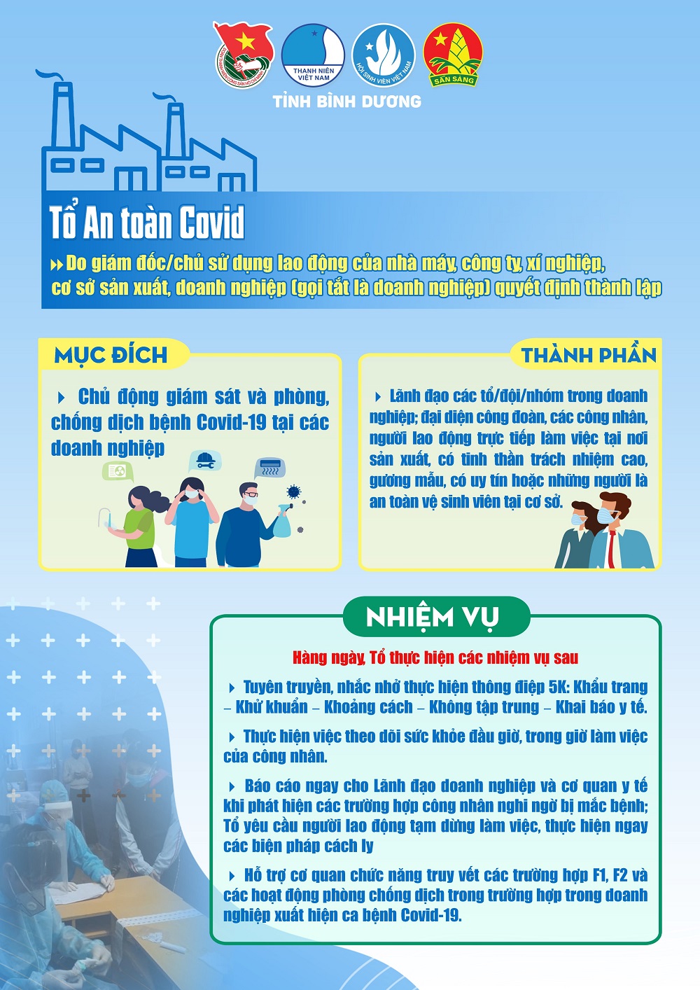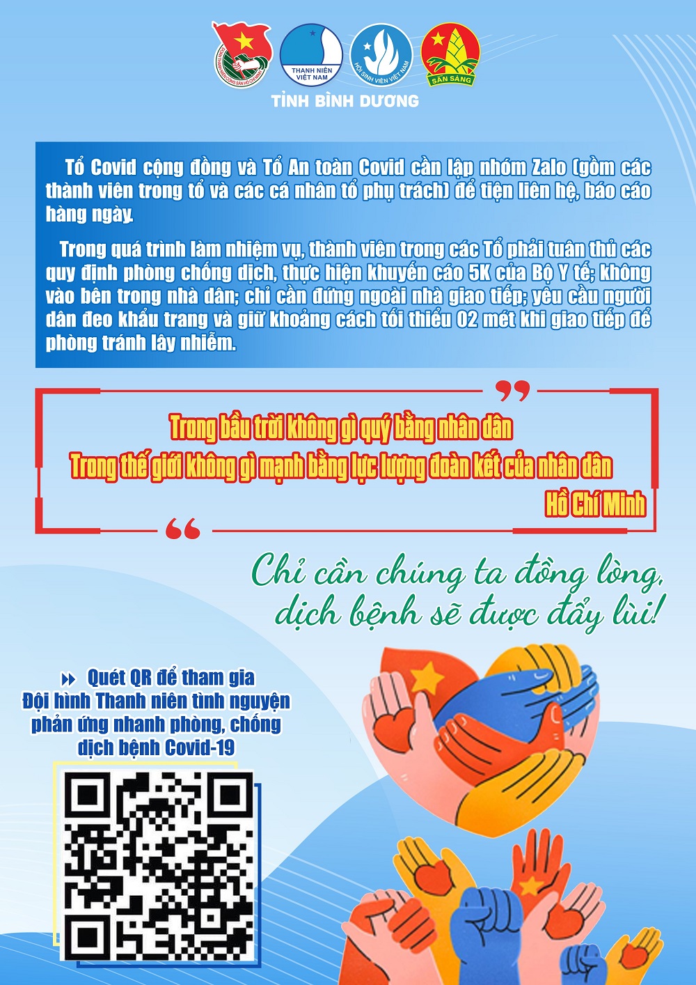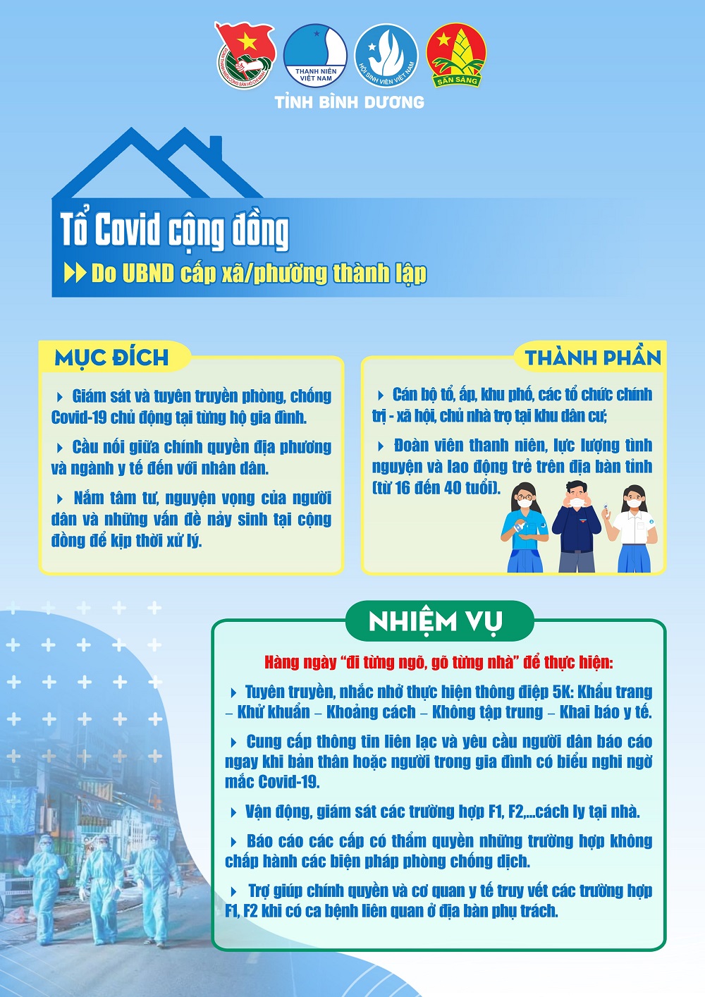 Trước những diễn biến phức tạp của tình hình dịch bệnh Covid-19, nhằm phát huy vai trò xung kích, tình nguyện của ĐVTN tỉnh trong chung tay phòng, chống dịch bệnh, Ban Thường vụ Tỉnh Đoàn vận động đoàn viên, hội viên, thanh niên tích cực tham gia Tổ Covid cộng đồng, Tổ An toàn Covid trong công tác giám sát dịch tại các địa phương trên địa bàn tỉnh Bình Dương.
