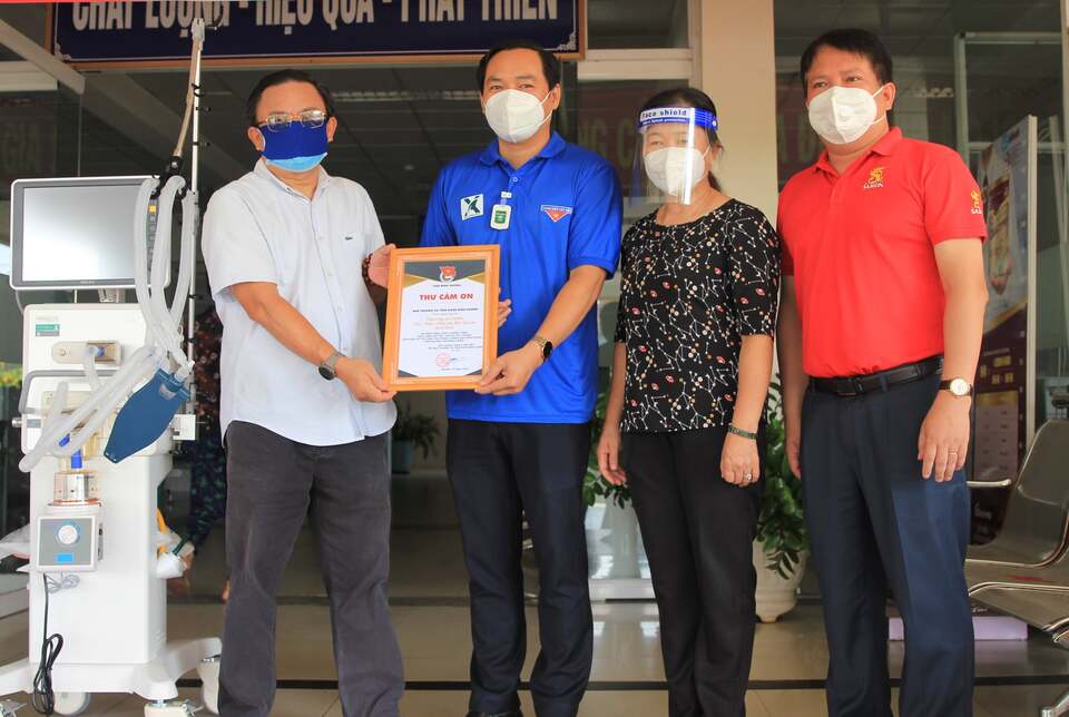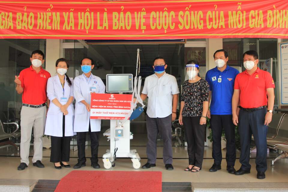 TTBD - Sáng ngày 19/8/2021, tại Bệnh viện Đa khoa tỉnh Bình Dương, Hội Liên hiệp Thanh niên Việt Nam cùng công ty Cổ phần SABECO đã tổ chức trao tặng 01 Máy thở chống xâm nhập và không xâm nhập MEK-ics MV2000 EVO 5 Korea, 12 ngàn khẩu trang y tế N95 và 12 ngàn áo bảo hộ, 6.300 chai nước rửa tay sát khuẩn và 2.800 thùng nước uống đóng chai đến các bệnh viện nhằm tiếp sức cho lực lượng tuyến đầu.