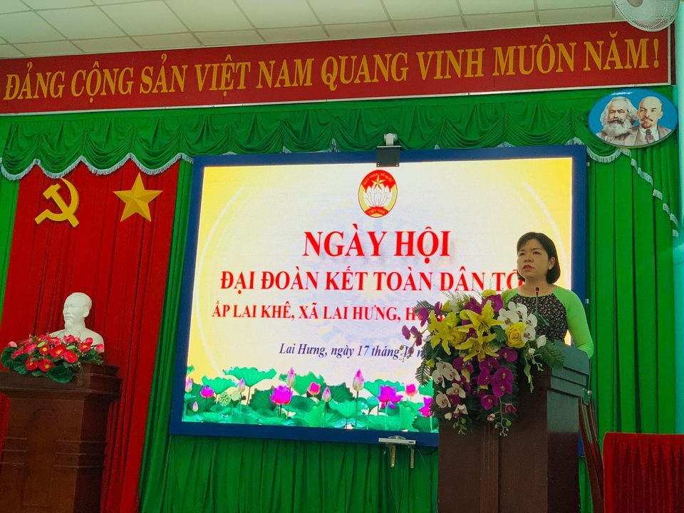 Phát biểu tại chương trình, đồng chí Nguyễn Thị Ngọc Xuân – Đại biểu Quốc hội Khoá XV, Tỉnh ủy viên, Bí thư Tỉnh Đoàn trân trọng chúc mừng và biểu dương những kết quả tiêu biểu mà ấp Lai Khê đã đạt được trong thời gian qua. Trong thời gian tới, đồng chí mong muốn ở ấp sẽ tiếp tục đoàn kết trên các mặt trận, xây dựng gia đình văn hoá, ấm no, tiến bộ và hạnh phúc; xây dựng ấp văn hóa, xây dựng địa phương ngày càng phát triển. Bên cạnh đó, tiếp tục thực hiện nghiêm các biện pháp phòng, chống dịch bệnh Covid-19 theo quy định; tiếp tục phát huy tinh thần tương thân, tương ái, quan tâm các đối tượng bị ảnh hưởng bởi dịch Covid-19; chú trọng đến các hoạt động nâng cao trình độ văn hoá, đặc biệt là việc làm, lao động, học nghề; giáo dục con em tuân thủ pháp luật, không vướng vào tệ nạn xã hội như ma tuý, tội phạm; đẩy mạnh tuyên dương các điển hình tiêu biểu trên các lĩnh vực;…