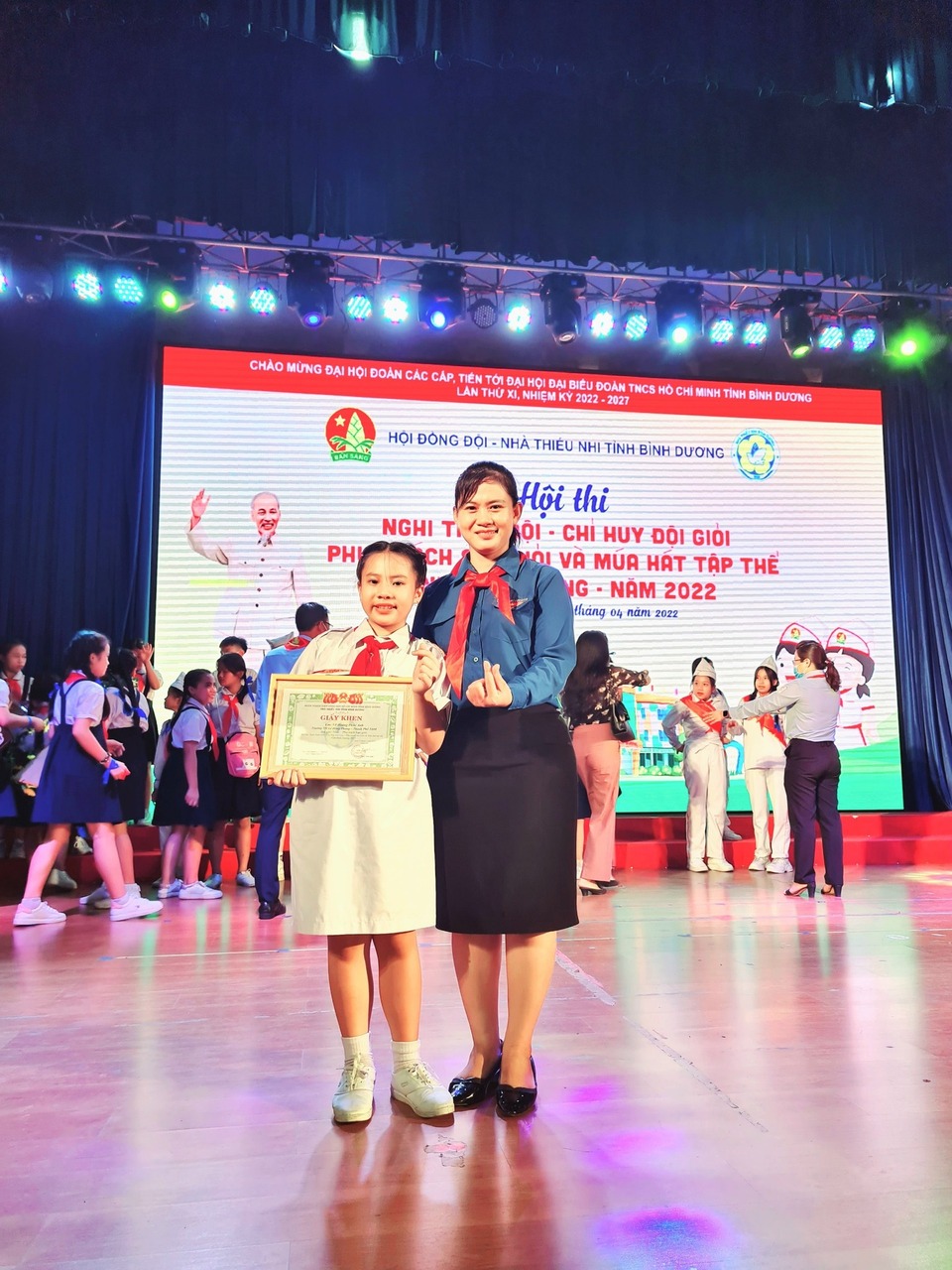 Qua rất nhiều cố gắng và nỗ lực tại các cuộc thi phong trào của Đội, thể dục thể thao, học tập ngoại ngữ em đã có bề dày thành tích đáng nể các cấp tiêu biểu như: Bằng khen đạt thành tích xuất sắc trong phong trào học ngoại ngữ 2019 – 2020; Giải Nhất Phụ trách sao giỏi Hội thi Nghi thức Đội – Chỉ huy Đội – Phụ trách sao giỏi và múa hát tập thể tỉnh Bình Dương 2021 – 2022; Giải Nhất khối tiểu học Hội thi Nhà sử học nhỏ tuổi tỉnh Bình Dương 2021 – 2022; Giải Nhất Ca hát khối tiểu học Hội thi Hoa nắng sân trường chào mừng 20/11 tỉnh Bình Dương 2021 – 2022; Giải Ba Hội thi tìm kiếm MC học đường tỉnh Bình Dương năm 2020 – 2021; giải Ba Vẽ tranh khối tiểu học Hội thi Hoa nắng sân trường chào mừng 20/11 tỉnh Bình Dương 2021 – 2022; danh hiệu nhà sử học nhỏ tuổi xuất sắc khối tiểu học Hội thi Nhà sử học nhỏ tuổi tỉnh Bình Dương 2021 – 2022;…