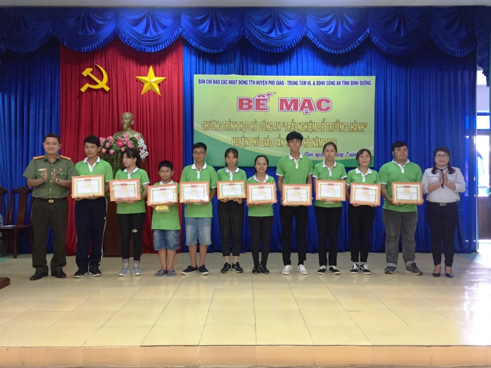TTBD - Chiều ngày 24/7/2018, Ban chỉ đạo các hoạt động TTN huyện Phú Giáo phối hợp với Trung tâm Huấn luyện và bồi dưỡng nghiệp vụ Công an tỉnh Bình Dương tổ chức Bế mạc chương trình học kỳ Công an “Trải nghiệm để trưởng thành” lần thứ I, Hè năm 2018, tại hội trường Khối vận huyện Phú Giáo.