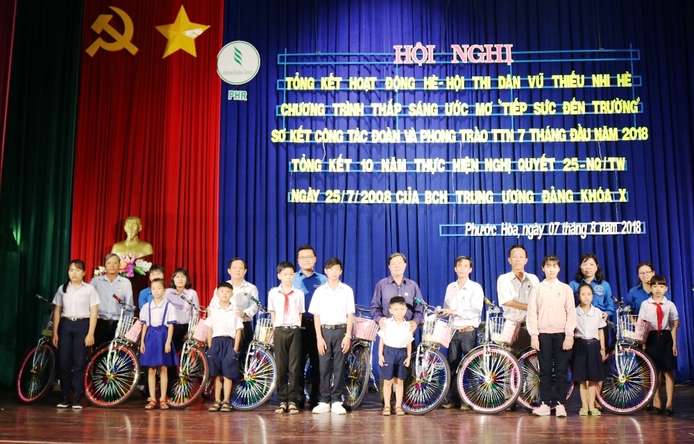 Sau phần tranh tài sôi nổi Hội thi múa dân vũ là chương trình “Thắp sáng ước mơ - Tiếp sức đến trường năm 2018” của Đoàn thanh niên Công ty phối hợp cùng Công Đoàn và Hội cựu chiến binh Công ty thực hiện; Chương trình đặc biệt nhận được sự quan tâm, ủng hộ của các mạnh thường quân, các Cô – Chú Lãnh đạo Công ty và Nhà Sách Fabico. Chương trình đã trao 10 chiếc xe đạp cùng 10 phần quà cho10 em học sinh có hoàn cảnh khó khăn là con công nhân công ty và con em địa phương đã có thành tích tốt trong học tập, với kinh phí 15.000.000 đồng.