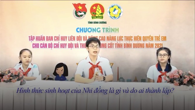 TTBD - Sáng ngày 11/7/2021, Chuyên đề số 3 trong chuỗi Chương trình Livestream “Tập huấn Ban Chỉ huy Liên Đội và nâng cao năng lực thực hiện quyền trẻ em cho cán bộ Chỉ huy đội và thiếu nhi nòng cốt tỉnh Bình Dương năm 2021” với chủ đề “Đoàn Thanh niên – Bạn đồng hành với thanh thiếu nhi” do Ban Thường vụ Tỉnh Đoàn, Hội đồng Đội tỉnh Bình Dương phối hợp cùng Nhà Thiếu nhi thực hiện lên sóng đã nhận được sự quan tâm và tham gia của đông đảo thiếu nhi, đội viên trong toàn tỉnh.