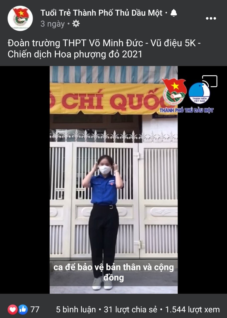 TTBD - Thực hiện Kế hoạch Chiến dịch Thanh niên Tình nguyện hè tỉnh Bình Dương năm 2021 Nhằm phát huy tinh thần xung kích của Hội viên, thanh niên ; tạo sân chơi lành mạnh và thông qua đó góp phần pháp huy vai trò, tinh thần năng động, sáng tạo của tuổi trẻ tỉnh Bình Dương trong công cuộc tham gia xây dựng, phát triển kinh tế, văn hóa, xã hội của tỉnh, đặc biệt trong việc tuyên truyền phòng, chống dịch bệnh Covid - 19. Ban Thư ký Hội LHTN Việt Nam tỉnh Bình Dương đã triển khai nhảy “Vũ điệu 5K” của Bộ Y tế trên nền tảng ứng dụng Tiktok với chủ đề "Thanh niên Bình Dương, kiên cường chống dịch Covid-19".