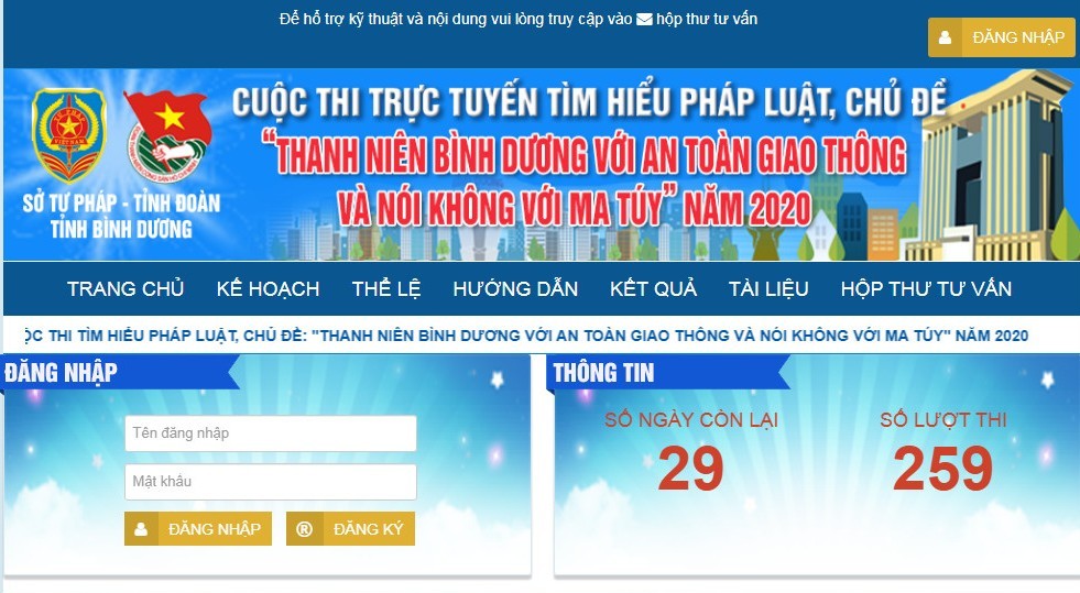TTBD - Nhằm tuyên truyền, phổ biến giáo dục pháp luật, trang bị kiến thức pháp luật, kỹ năng sống cũng như nâng cao nhận thức, ý thức tuân thủ pháp luật của đoàn viên, thanh niên trên địa bàn tỉnh nhất là các quy định pháp luật liên quan đến an toàn giao thông và phòng, chống ma túy; Ban Thường vụ Tỉnh Đoàn Bình Dương và Sở Tư pháp phối hợp tổ chức cuộc thi trực tuyến tìm hiểu pháp luật chủ đề “Thanh niên Bình Dương với an toàn giao thông và nói không với ma túy” năm 2020.